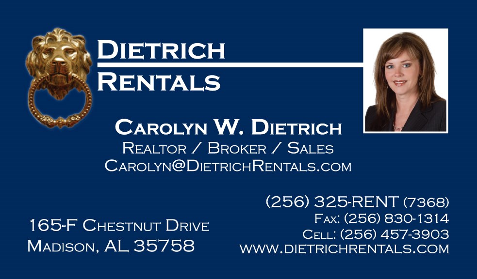Welcome to Dietrich Rentals! We are a local property management company servicing Madison, Limestone and Morgan County. We provide several options for owners who want to earn great rental income but don't want to deal with the daily hassle of managing their homes! We treat each home as if it were our own and we strongly believe in quality over quantity!