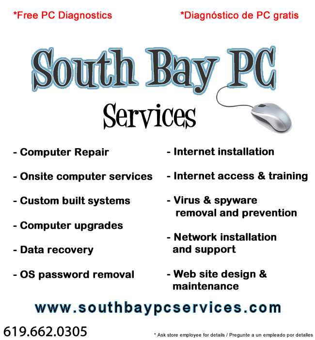 South Bay PC Services provides PC desktop and Laptop computer repair, support, and service to Chula Vista, San Diego, San Ysidro, Otay Mesa, Imperial Beach, South San Diego, Otay Ranch, Eastlake, and National City. Our Services areas are more formally know as South Bay San Diego.