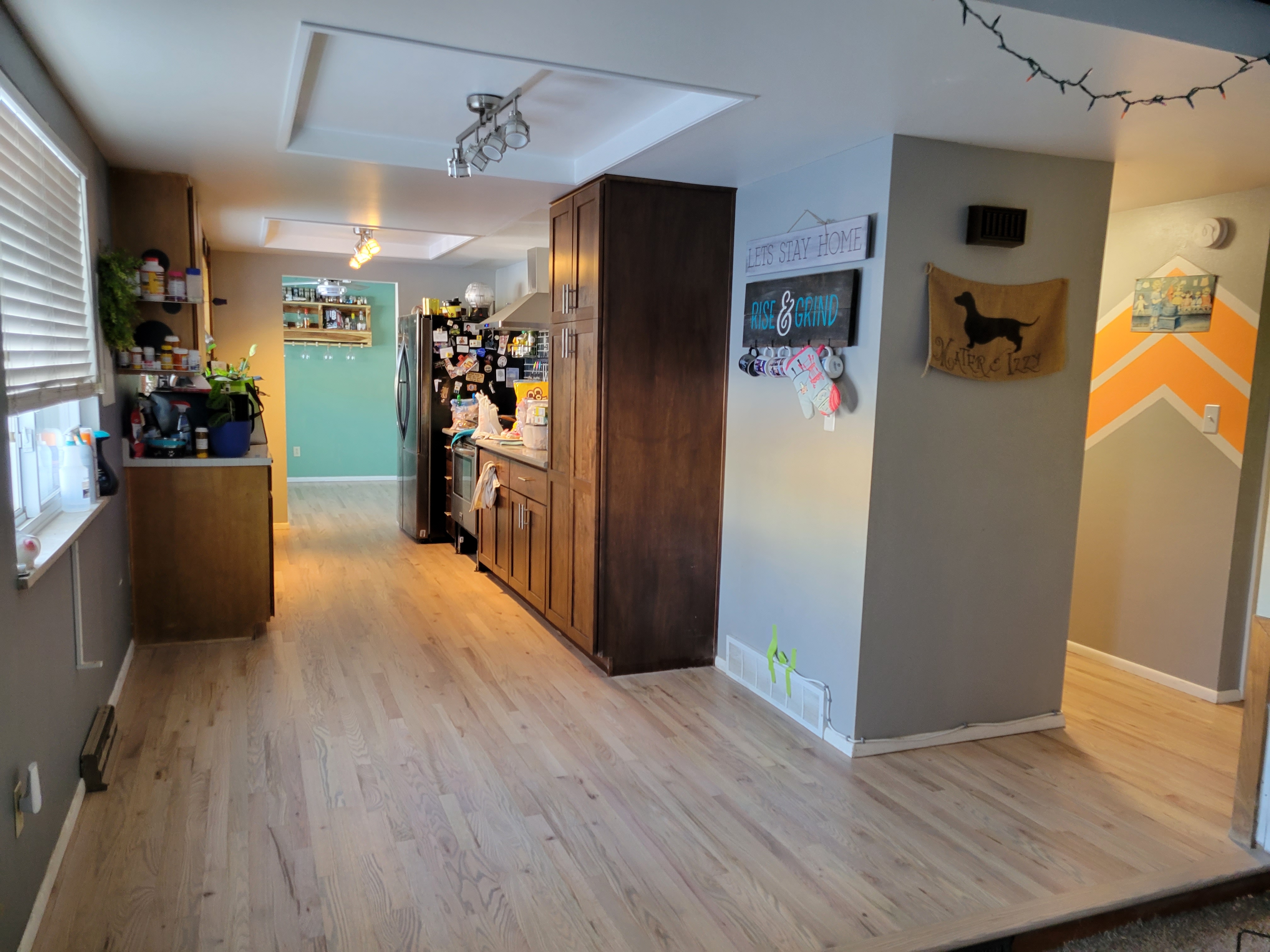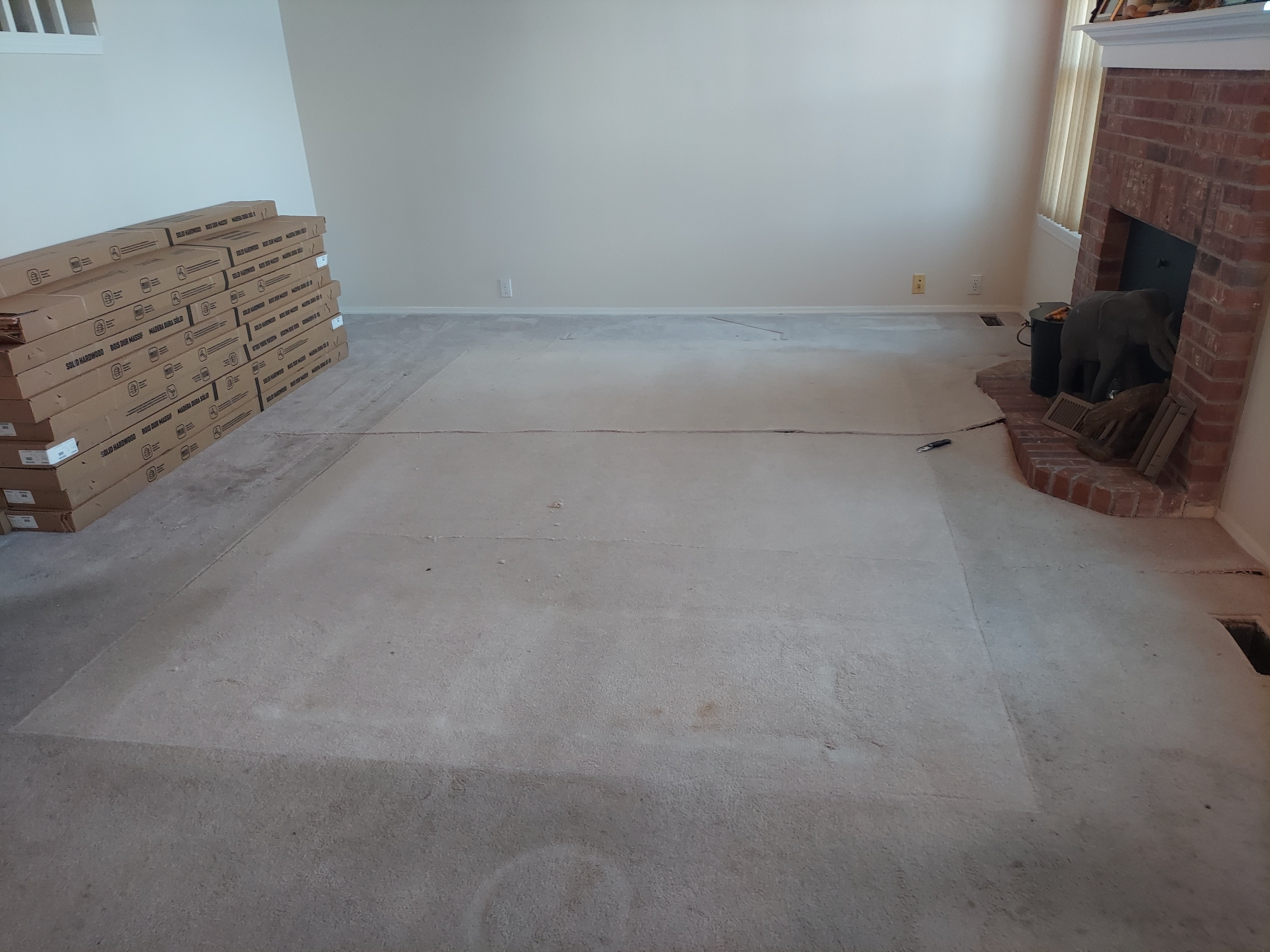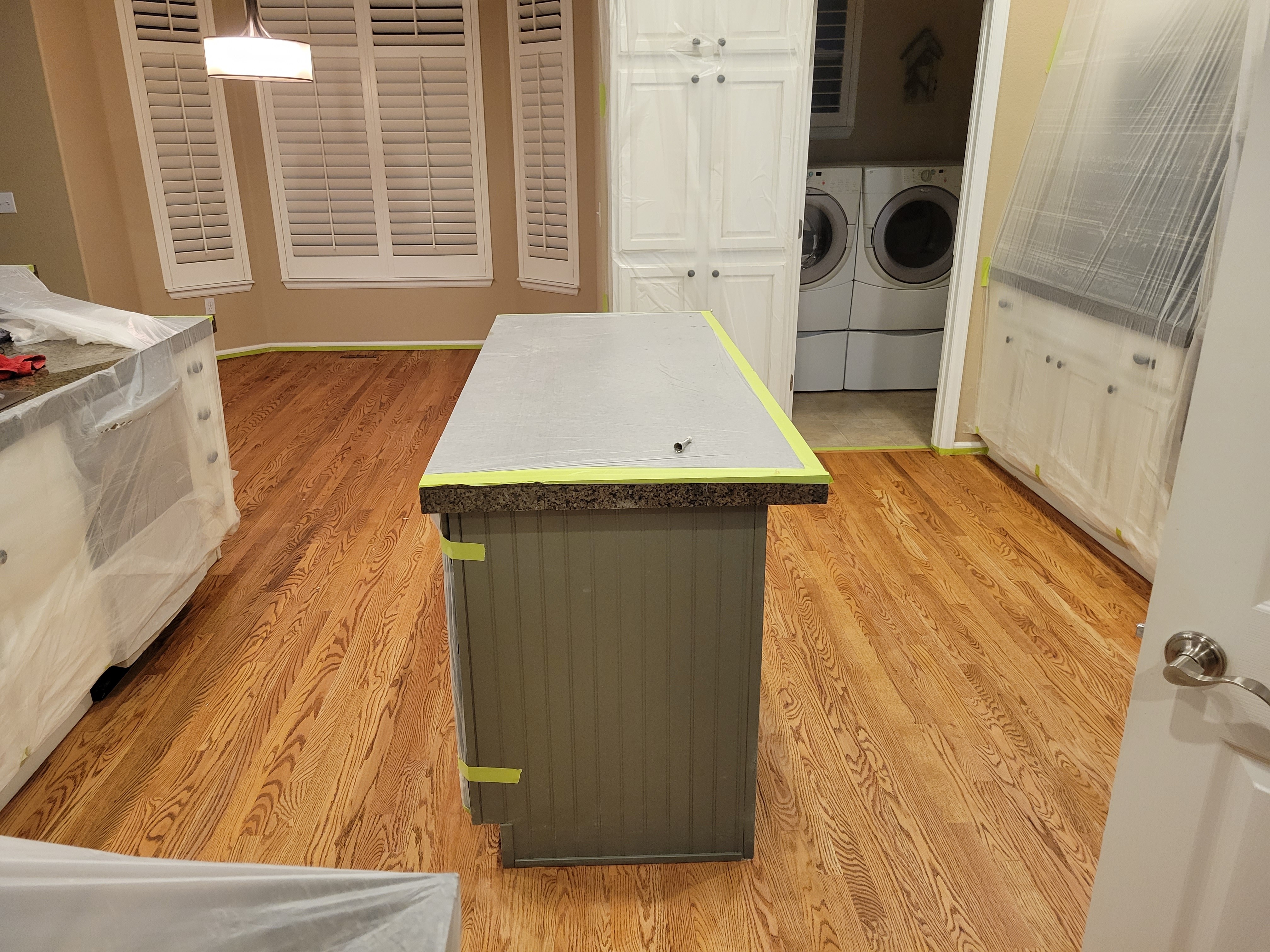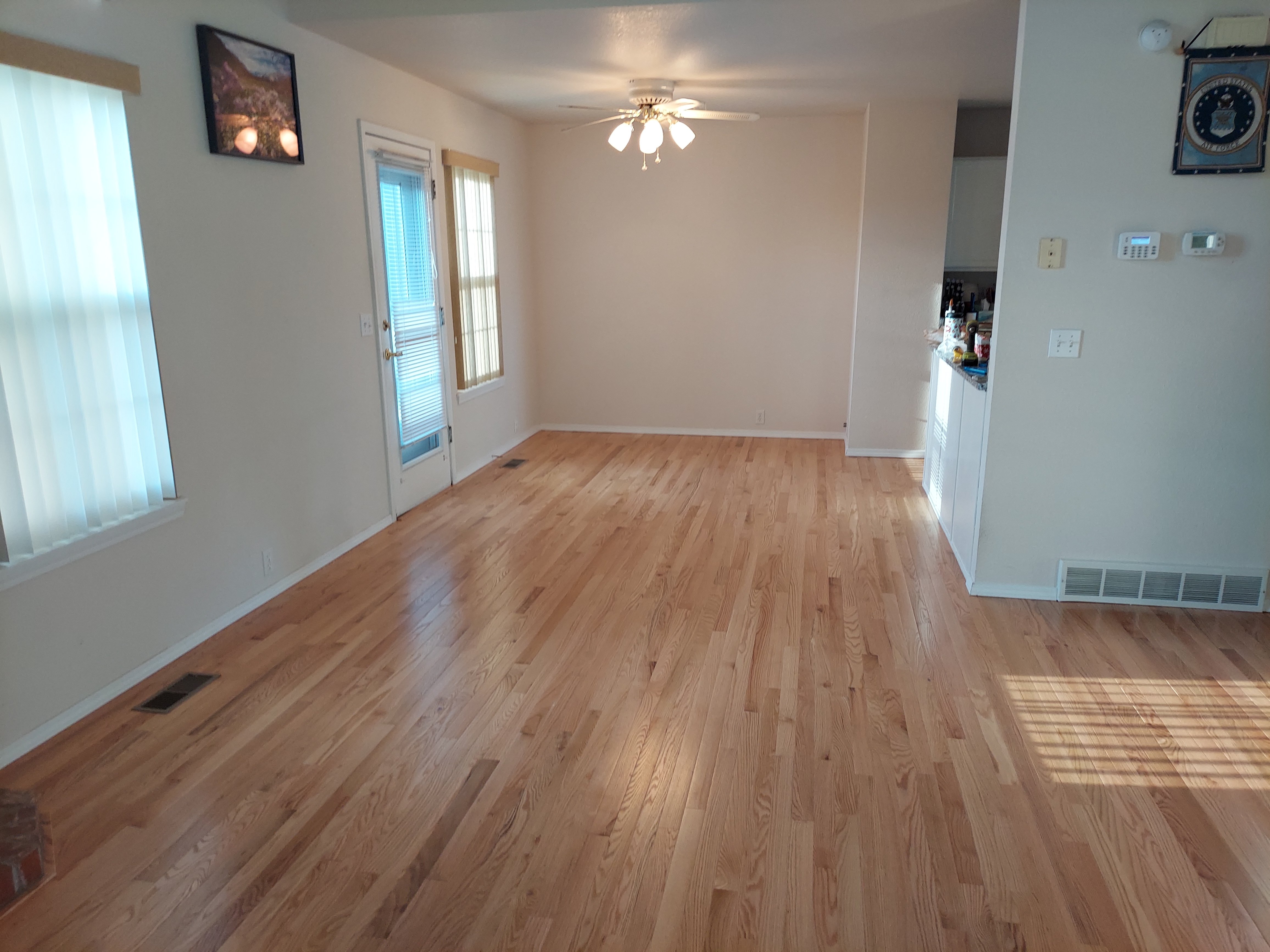 On time, clean installation of plastic sheeting to eliminate dust in remainder of the house, helped move appliances and table and chairs Great finished flooring