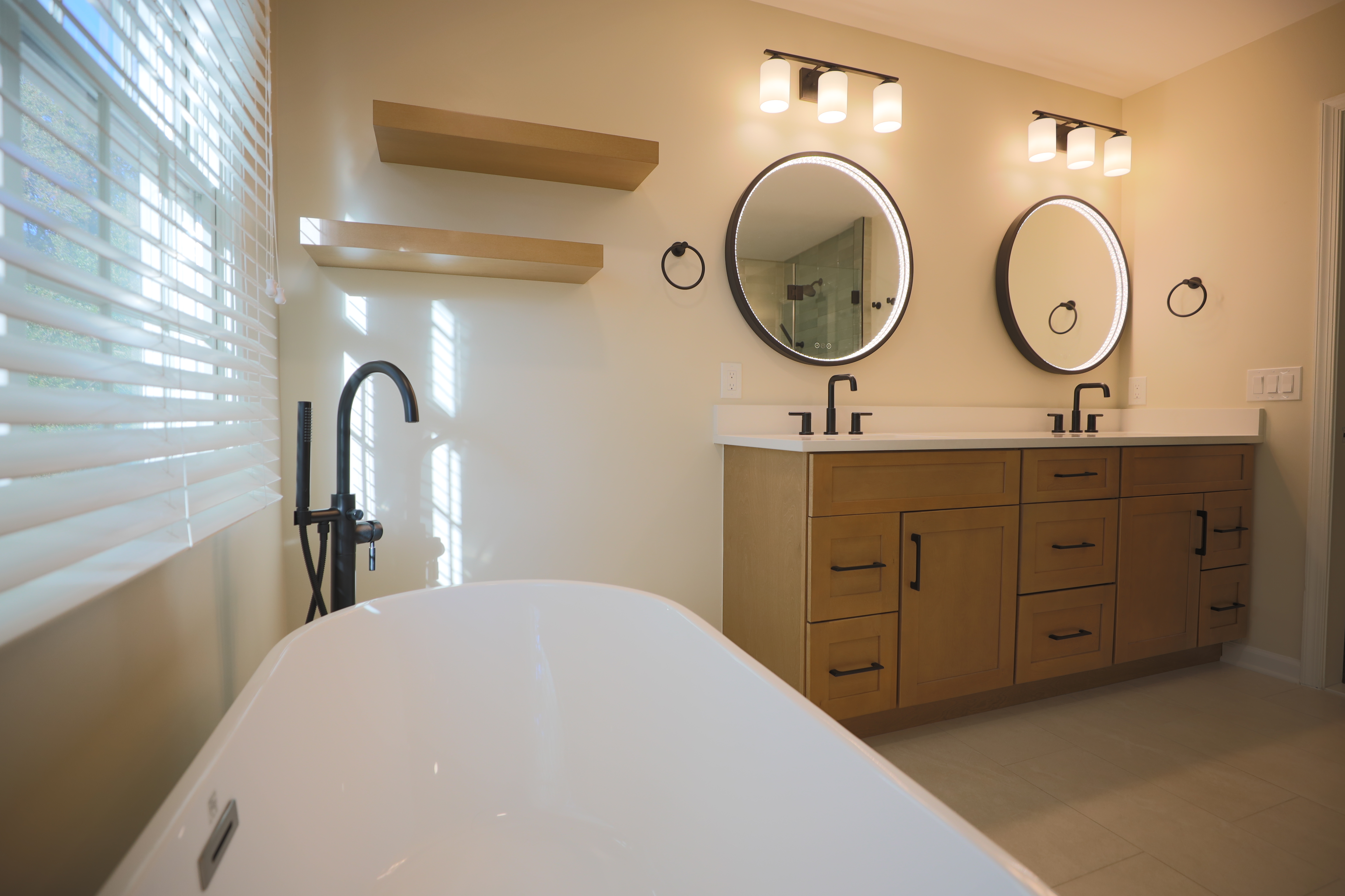 Bathroom remodeled with bathtub & standing shower, double sink and double toilet - Ashburn