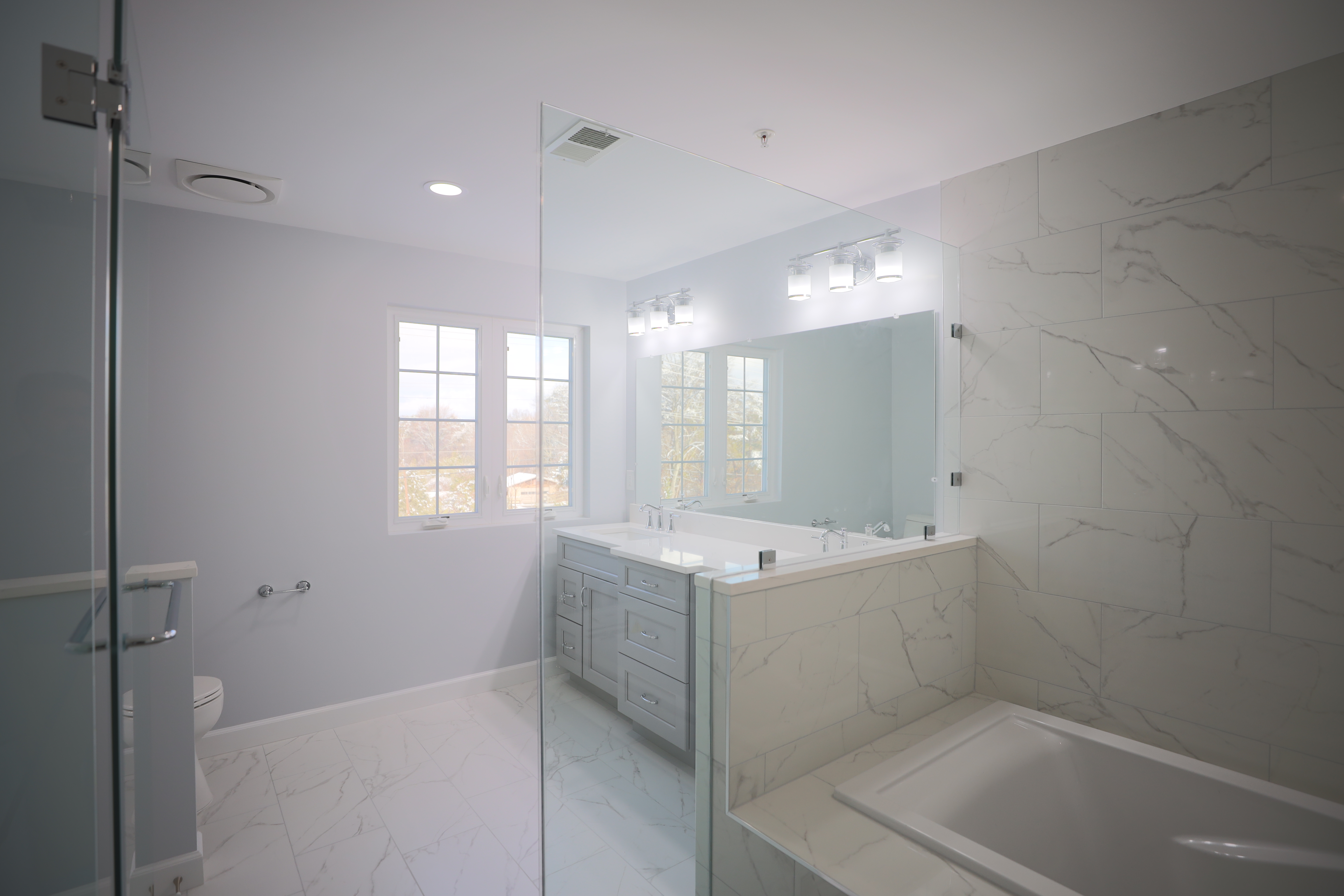 Bathroom remodeled with bathtub & standing shower, double sink and double toilet - Maryland