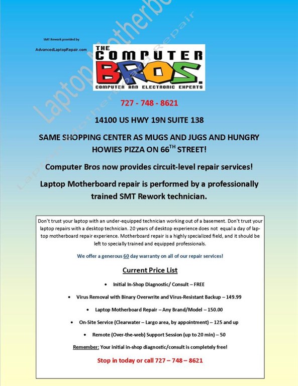 The Computer Bros has teamed up with AdvancedLaptopRepair.com to provide professional quality laptop motherboard repair to home users and computer repair centers throughout the country. Motherboard repairs are performed by a professionally trained SMT Rework Operator. Instant Message a tech on AIM right now: Our AOL Screenname is TheComputerBros Or Call 727 - 748 - 8621