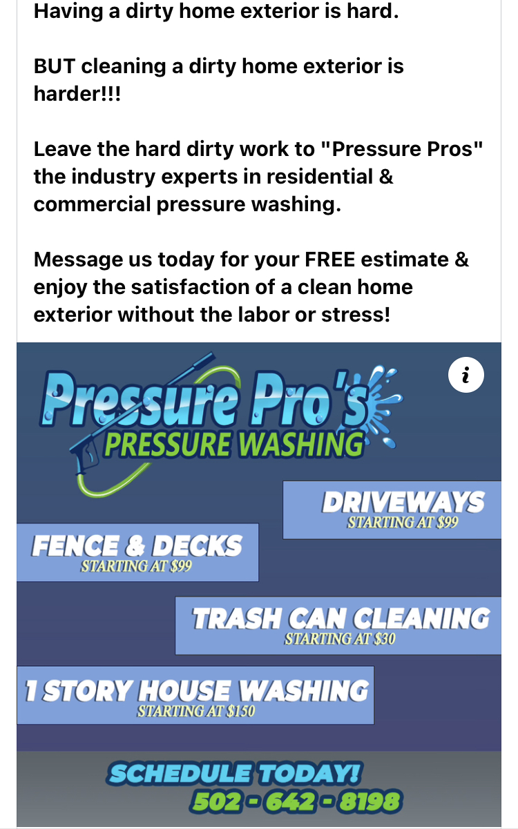 Pressure pros is a locally owned pressure washing business based out of Nicholasville Kentucky and serve surrounding areas! Customer satisfaction is our priority! Give us a call for all your pressure washing needs !