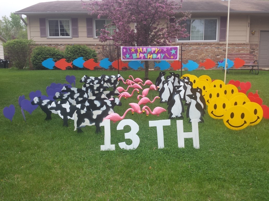 We deliver flamingo surprise lawn displays (and other critters too,) to your loved one's yard while they sleep. They wake up to a wonderful surprise! Formerly Flamingos By The Yard. We can install party decorations for you in Minneapolis, Saint Paul and all surrounding suburbs. Need them far away? You can also rent flamingos and other items from us and install them yourself.