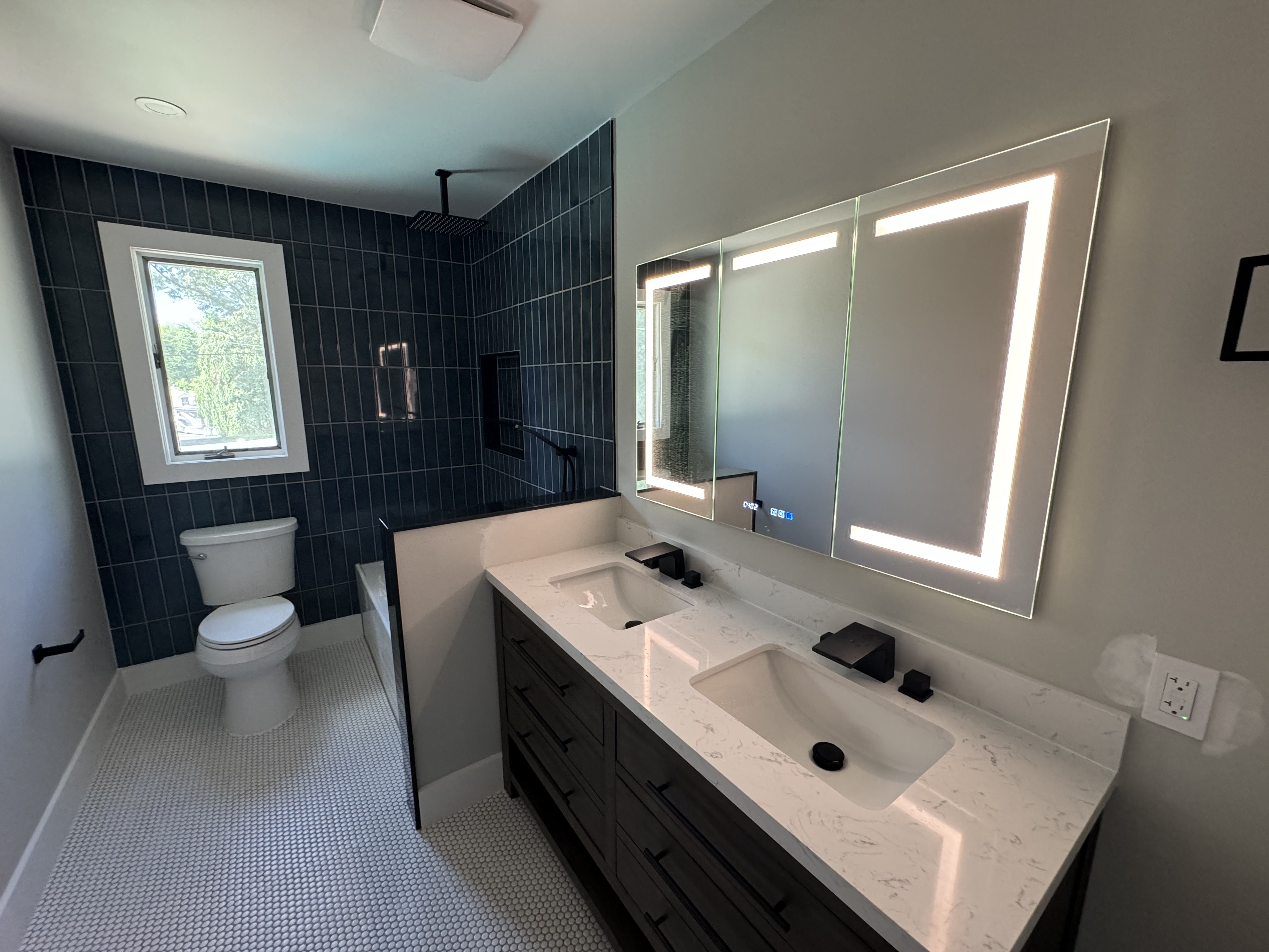 Modern Bathroom Remodel with Double Vanity & Blue Tile Shower