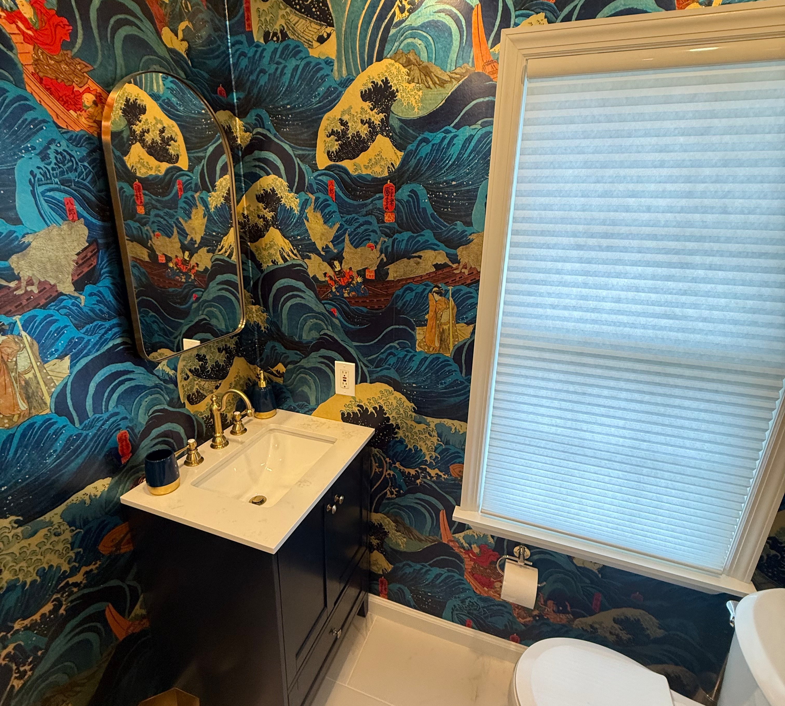 Bold Wave Bathroom Remodel with Marble & Gold Accents