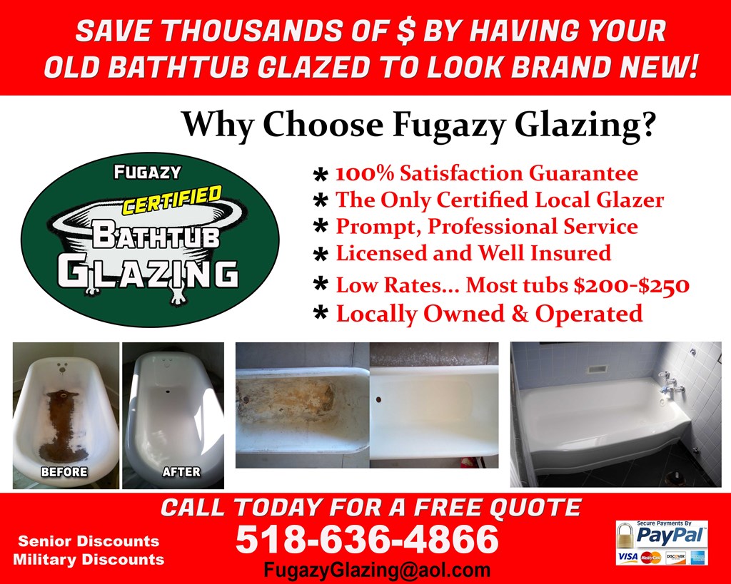 Fugazy Glazing offers the following services: Tub, sink and tile glazing.