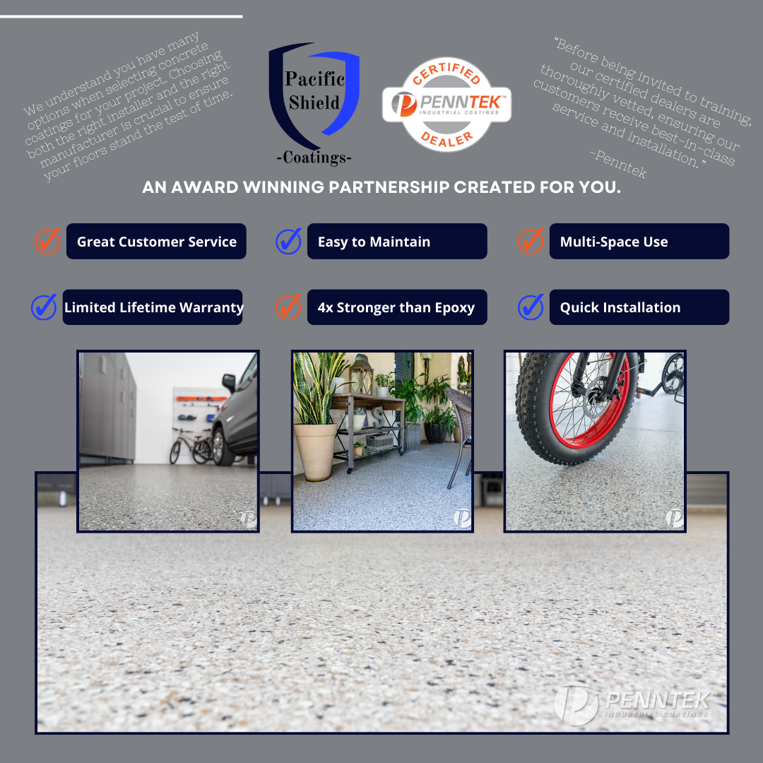 At Pacific Shield Coatings, our mission is to deliver unparalleled quality and durability through the application of Penntek floor systems in residential and small commercial spaces across Oregon and SW Washington. With a steadfast commitment to excellence as a veteran owned business, we strive to protect and enhance our customers' environments while exceeding industry standards for performance and customer satisfaction. Through innovation, integrity, and superior craftsmanship, we aim to be the premier choice for concrete coatings solutions, enhancing the beauty and functionality of every space we touch.