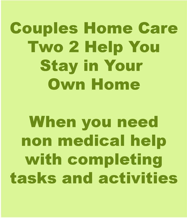Couples Home Care- for those who do not need medical care, but do need assistance in completing activities and tasks. Instead of just one person, you have two people to assist you in the maintenance of your lifestyle within your own home. Employment minimum of 4 hour segments, maximum of 12 hour segments per 24 hours. Cost per hour for two people is $25.