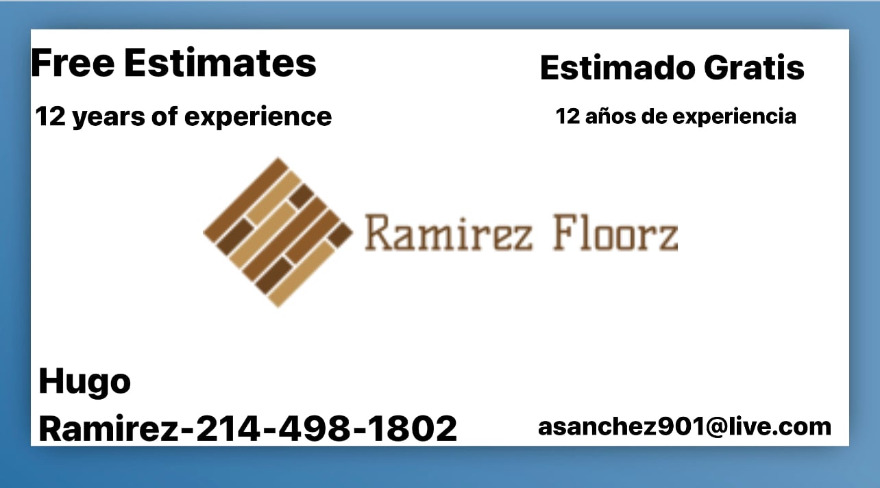 Hello my name is Hugo Ramirez. I have 12 years of experience installing floors. I install, carpet, vinyl, laminate, plank, etc. Im very clean and detailed in my work. I want to make sure each job is the best work Ive ever done. Give me the opportunity to help you improve your floor. Hola mi nombre es Hugo Ramirez. Tengo 12 anos de experiencia instalando pisos. Tengo experiencia instalando, carpeta, vinyl, laminado, plank, etc. Soy muy limpio y detallista con mi trabajo. Trabajo duro y me aseguro que cada trabajo es mi mejor trabajo. Dame la oportunidad de mejorar tu piso.