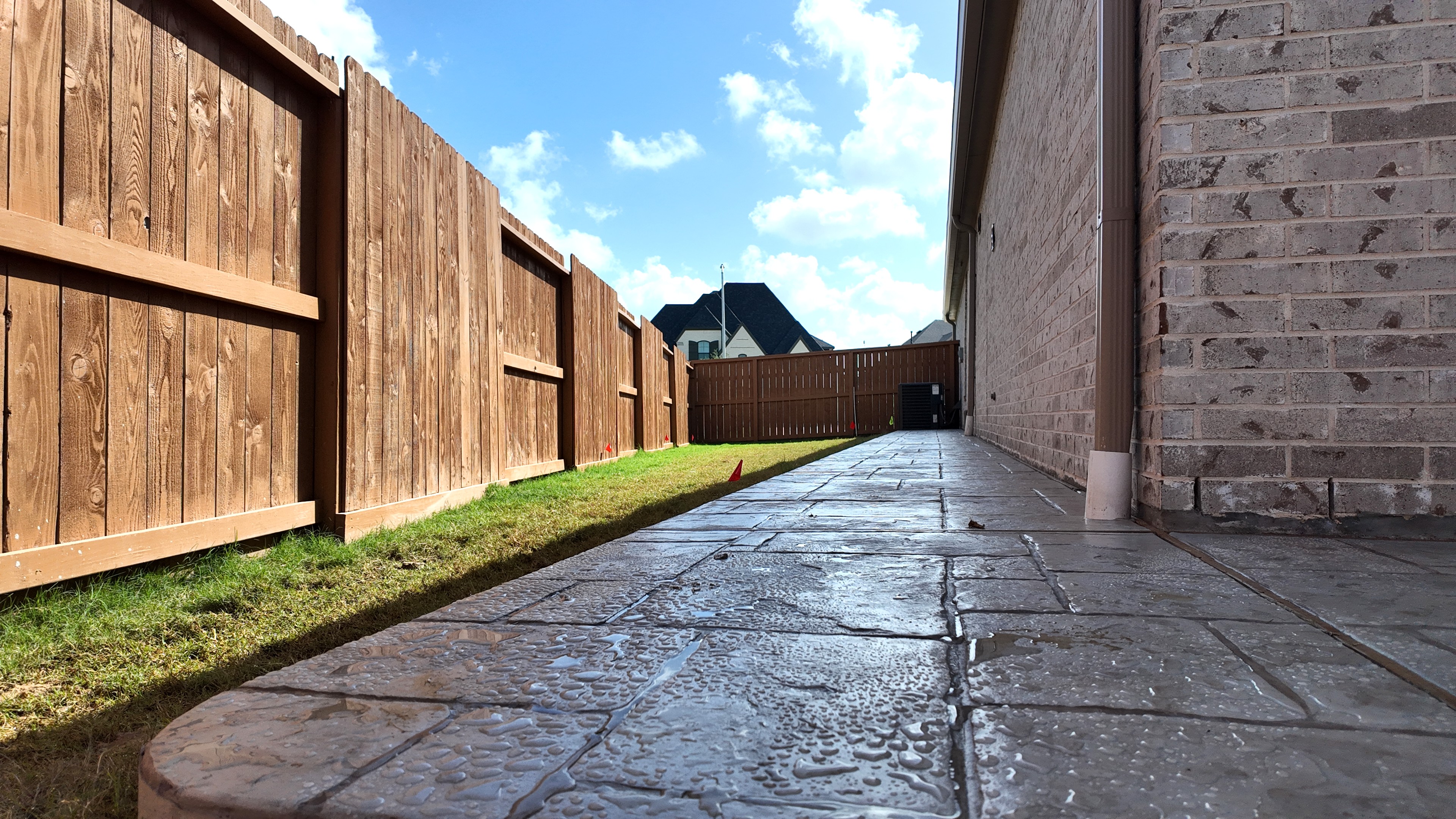 Decorative Concrete Walkaway and Backyard Patio with Sprinkeler System