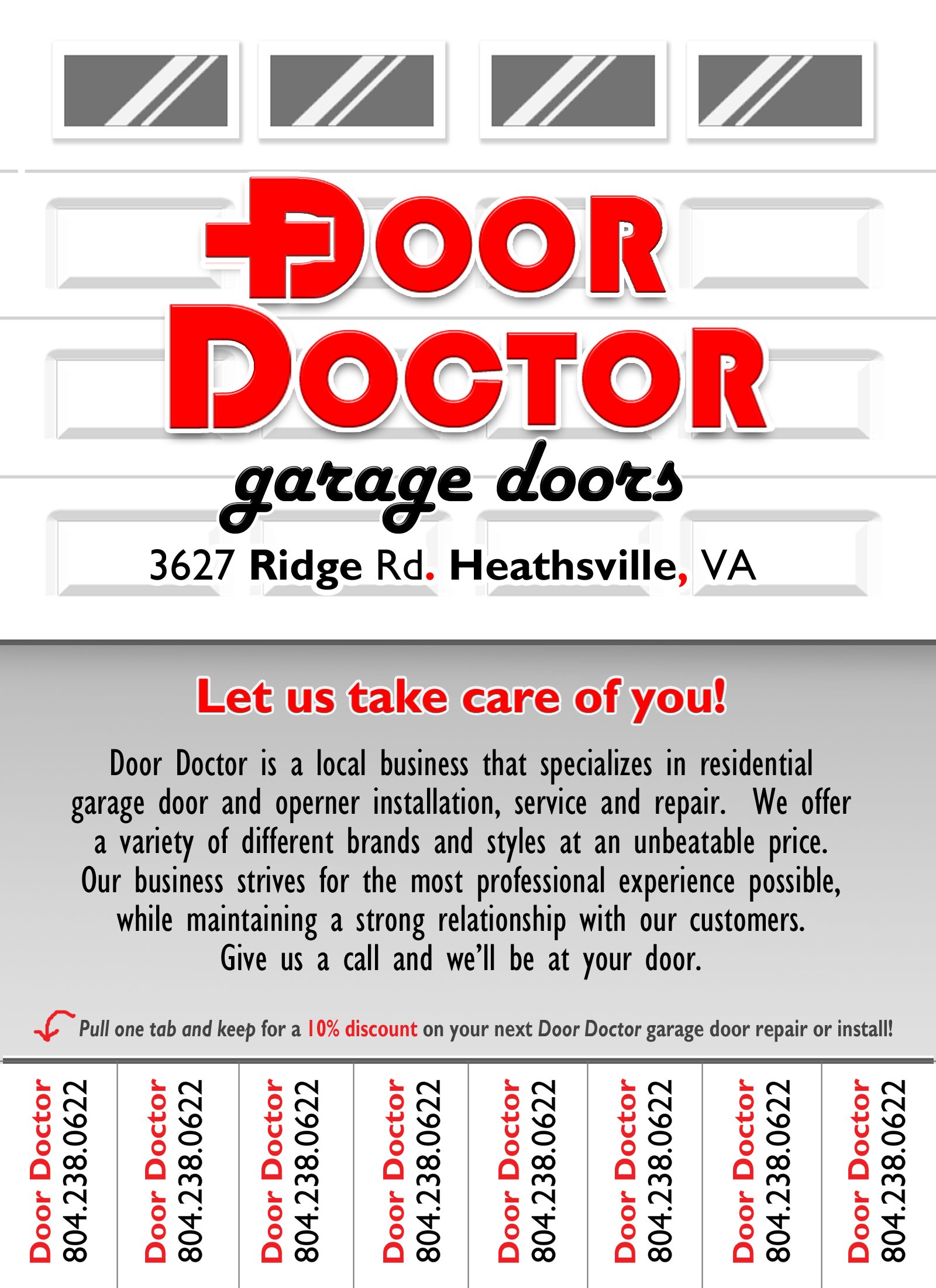 Garage Door Doctor is a local garage door business that services along or the Northern Neck and surrounding areas. Our business handles residential and commercial garage door and opener installation, repair, and servicing. We also cover a range of other services including but not limited to: box truck roll up doors, commercial and residential entry doors, door closers, awnings, gates, trailer ramp springs and much more Here! Here at Garage Door Doctor, we specialize at making each and every customer's needs a priority by offering same day service, emergency service calls, contact free repair and installation, and mobile estimates just to name a few things! We pride ourselves on maintaining a perfect customer rating by exceeding your expectations unlike any other door company. We have spent the last ten years building relationships and experience in door installation and repair in the Northern Neck and beyond, let us do the same for you!