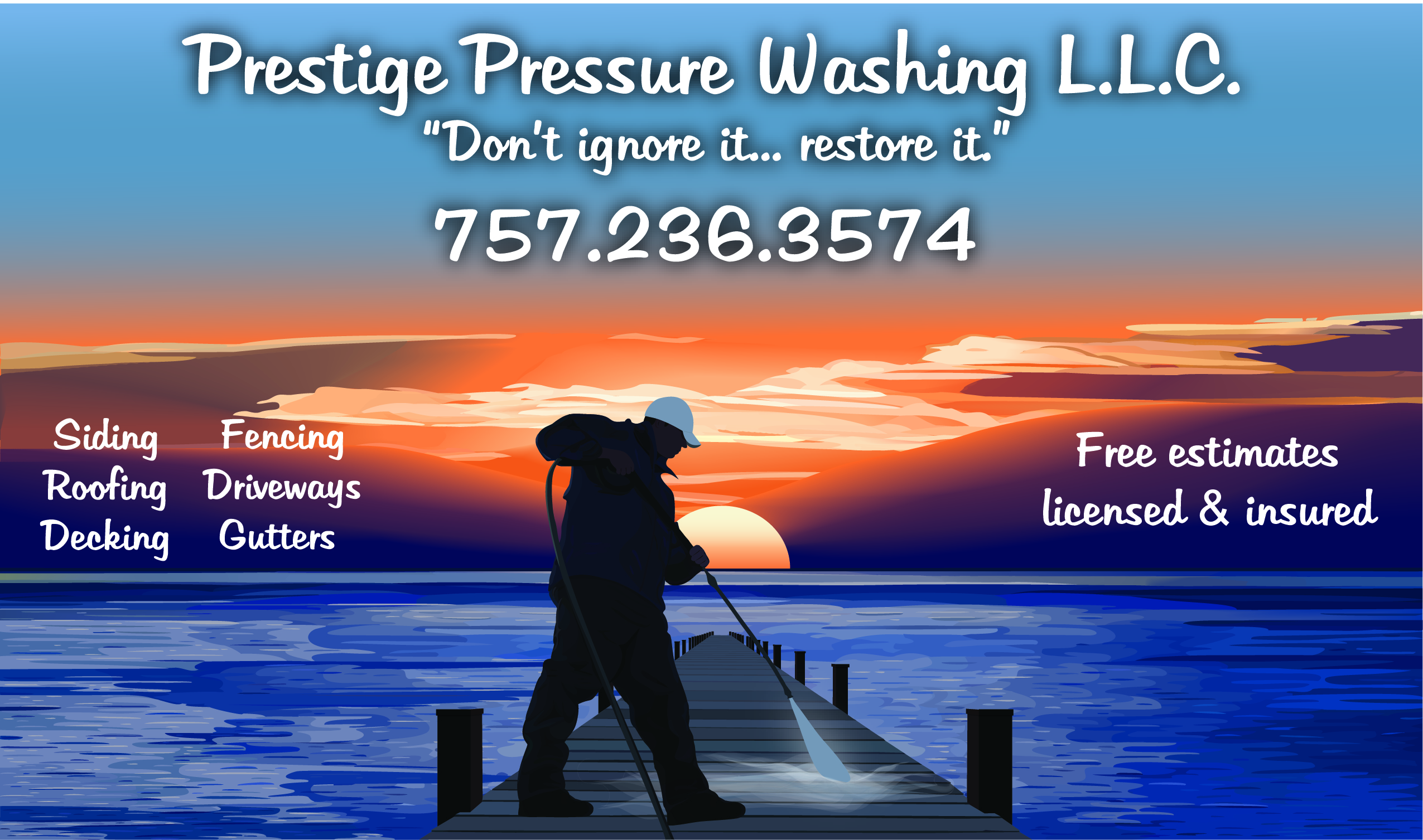Prestige Pressure Washing L.L.C. "Don't ignore it... restore it" specializes in all siding, roofing, decking, fencing, driveways, patios, etc...